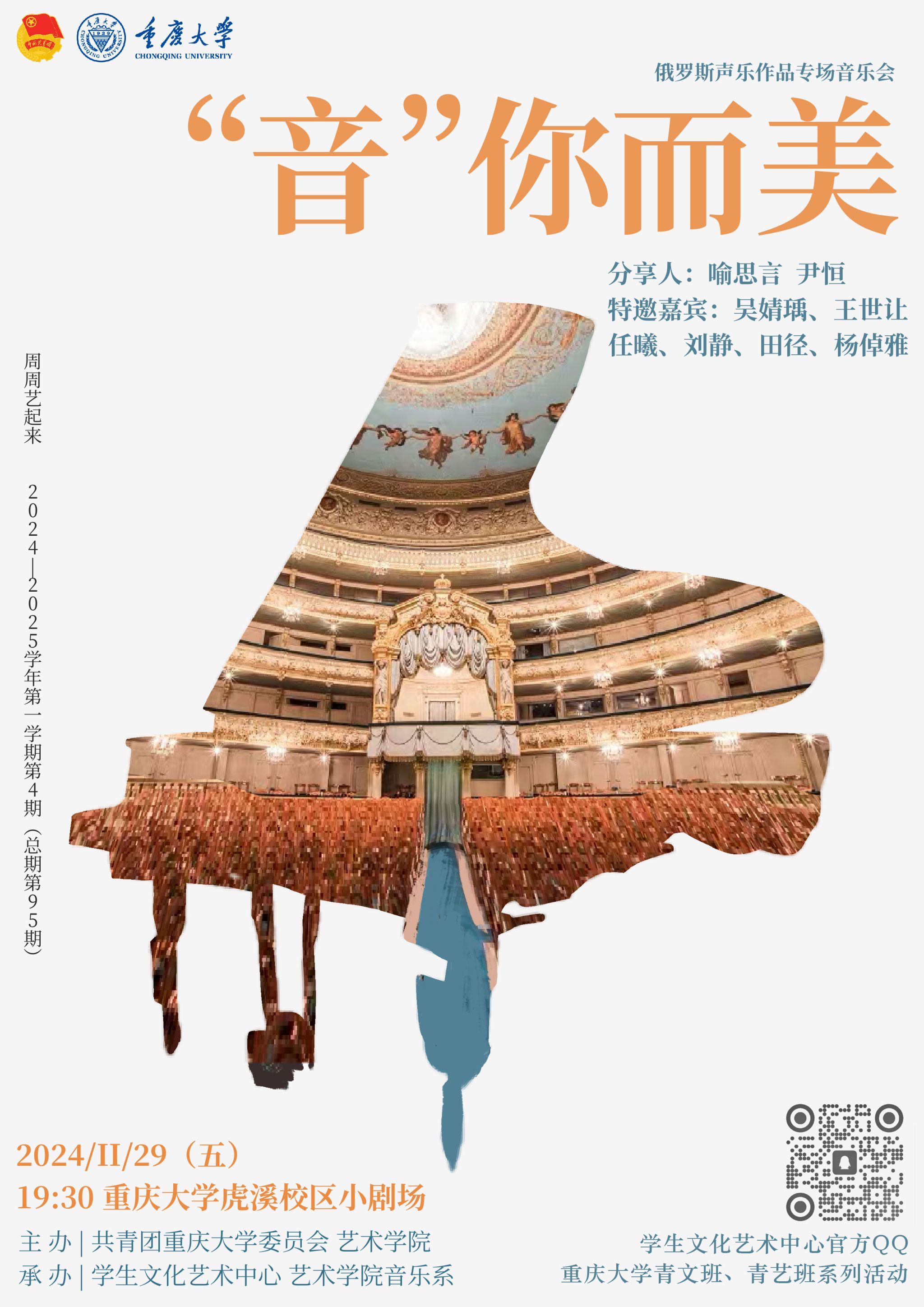 2024年11月29日,“音”你而美——俄罗斯声乐作品专场音乐会在调教漫画 虎溪校区小剧场唱响。此次活动由调教漫画 和共青团调教漫画 委员会主办,校团委学生文化艺术中心和调教漫画 音乐系承办。活动参演人员有调教漫画 音乐系副主任喻思言副教授及其教学班学生、音乐系教师尹恒。同时还邀请了重庆师范大学音乐学院副院长吴婧瑀教授、音乐表演系主任王世让副教授,重庆人文科技学院音乐系主任任曦、音乐系副教授刘静。杨倬雅...