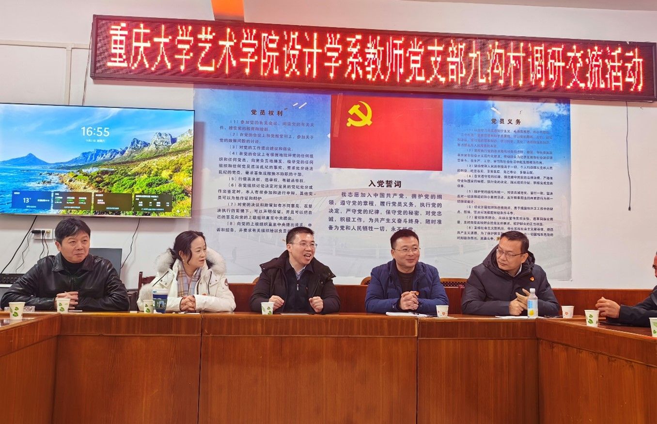 党委书记蒋华林率领设计学系教师党支部党员应邀到访宜宾翠屏区李庄镇九沟村党总支调研交流。九沟村党委书记颜静及党总支主要成员热情接待调研组一行。会议由颜静主持。