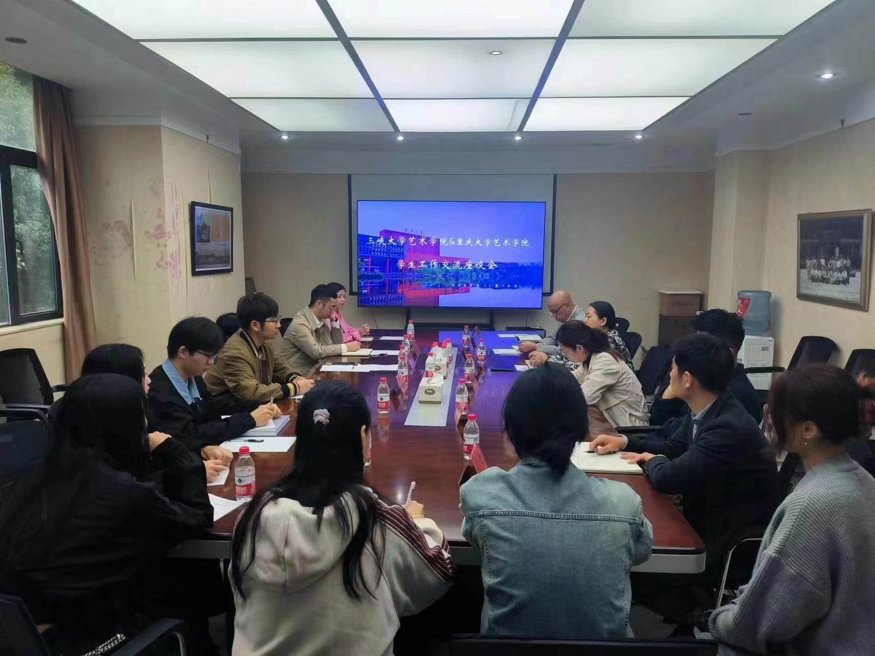 座谈会后,双方与会人员参观了在虎溪校区一食堂南广场举行的长江大保护科普绘画巡展,并合影留念。