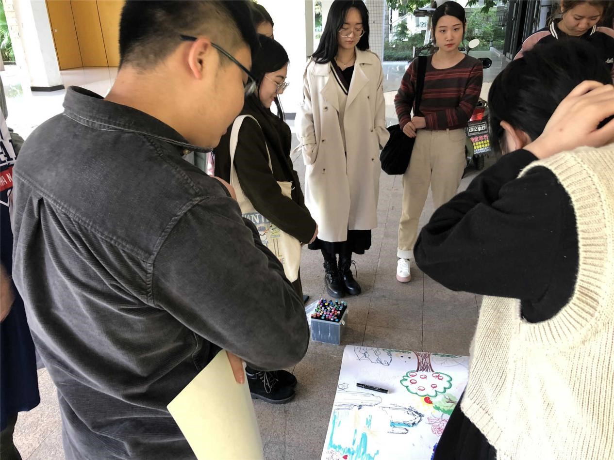 学院心理辅导员陈龙跟同学们交流时说,绘画具有古老的语言魅力,在释放人的心理压力方面举世瞩目。绘画作为一种心理语言,对于打开心扉、提高语言表达与交流能力方面有着重要意义,希望同学们放松心情,尽情参与其中。