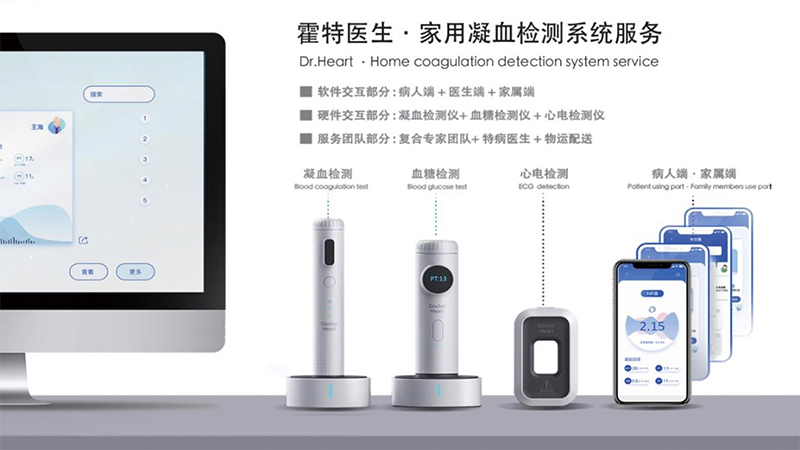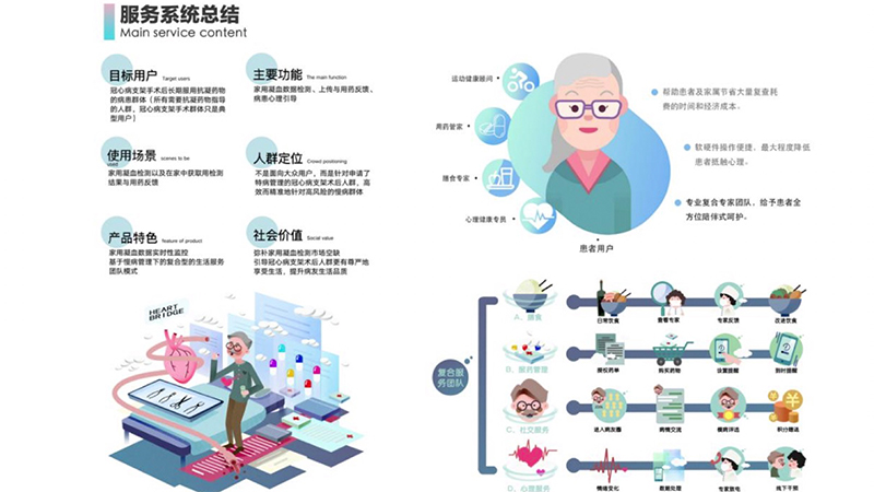 研究生赵德胜、杨宇辰、王梦雅与任绍阳共同合作完成,该服务系统主要针对心血管疾病患者的日常凝血检测管理,设计初期主要融入了民主化设计与无障碍化的理念,在硬件方面,团队不断迭代方案,尽可能地降低产品外观带来的非必要的生产成本提高,在保证凝血检测质量的前提下降低硬件成本,能够让更多的心血管疾病患者较低成本的获取产品与服务,考虑到中国有上千万心血管疾病患者,因此针对这类人群的设计,必须要让设计更接地气,更具有民主性。这也是设计师必须承担的社会责任,也正是这份担当精神,不断驱动着团队一次又一次的对系统和各个要素进行升级。