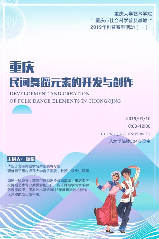 “重庆市社会科学普及基地”为依托,邀请到来自重庆师范大学音乐学院的颜聪教授开展2019年科普系列活动之一《重庆民间舞蹈元素的开发与创作》的主题讲座,项目负责人王海涛副教授主持会议,并介绍了重庆市科普基地系列活动及其意义。讲座主题鲜明,理论与实践相结合,为来自学校不同专业的同学们带来一场知识盛宴。现场气氛活跃,科普讲座圆满成功。