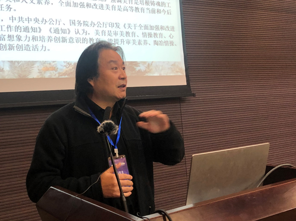 全国教育书画协会高等美术教育分会秘书长、清华大学美术学院绘画系教授,博士生导师李睦教授做了《艺术的亏欠》的主旨宣讲。李睦教授同时还是清华大学美术学院油画教研室主任、吴冠中研究中心副主任、清华大学精品课、教育部优秀网络公开课主讲人。从教三十余年,始终以自己独特的教育方式引导学生自尊、自信、自立,曾获得2次清华大学“良师益友”奖和多次其他院校级教学奖,2017北京市第十三届高等学校教学名师奖。本次宣讲的题目《艺术的亏欠》,是李睦教授从长期教授理工科高素质学生学习、理解艺术本质原理所获得的丰富教学经验的部分总结。对教学过程中所遇到的问题,李睦教授总结为九个主要方面。他指出,素质十分优秀的清华大学本科学生在面对艺术的时候常常出现许多亟待解决的问题。这些问题是:“他们对艺术的理解仅仅停留在知识和概念的层面上”;“他们习惯别人告知艺术中的美丑并坚信不疑”;“他们已经失去凭借自己的直觉去观察和感受艺术的能力”;“他们用以判断艺术的标准是绝对的、固定的而且是唯一的”;“他们将艺术技巧的崇拜当作对艺术精神的追求”,“他们习惯于在艺术中寻找为自己设定好的意义”;“他们对艺术中所有未知不再好奇并且抵触”;“他们羞于体验和参与艺术实践而且充满恐惧”;“他们坚信艺术只是艺术家的事情且绝对与自己无关”等。这些问题,实际上也是全国所有综合类高校美育教育所遇到的共同的问题。对这些问题的剖析与解决,将极大地改进对非艺术专业学生的美育教学效果,提升非艺术专业的审美认知水平,因而具有极高的学术价值,对广大综合高校美育教师有极大的启发意义。
