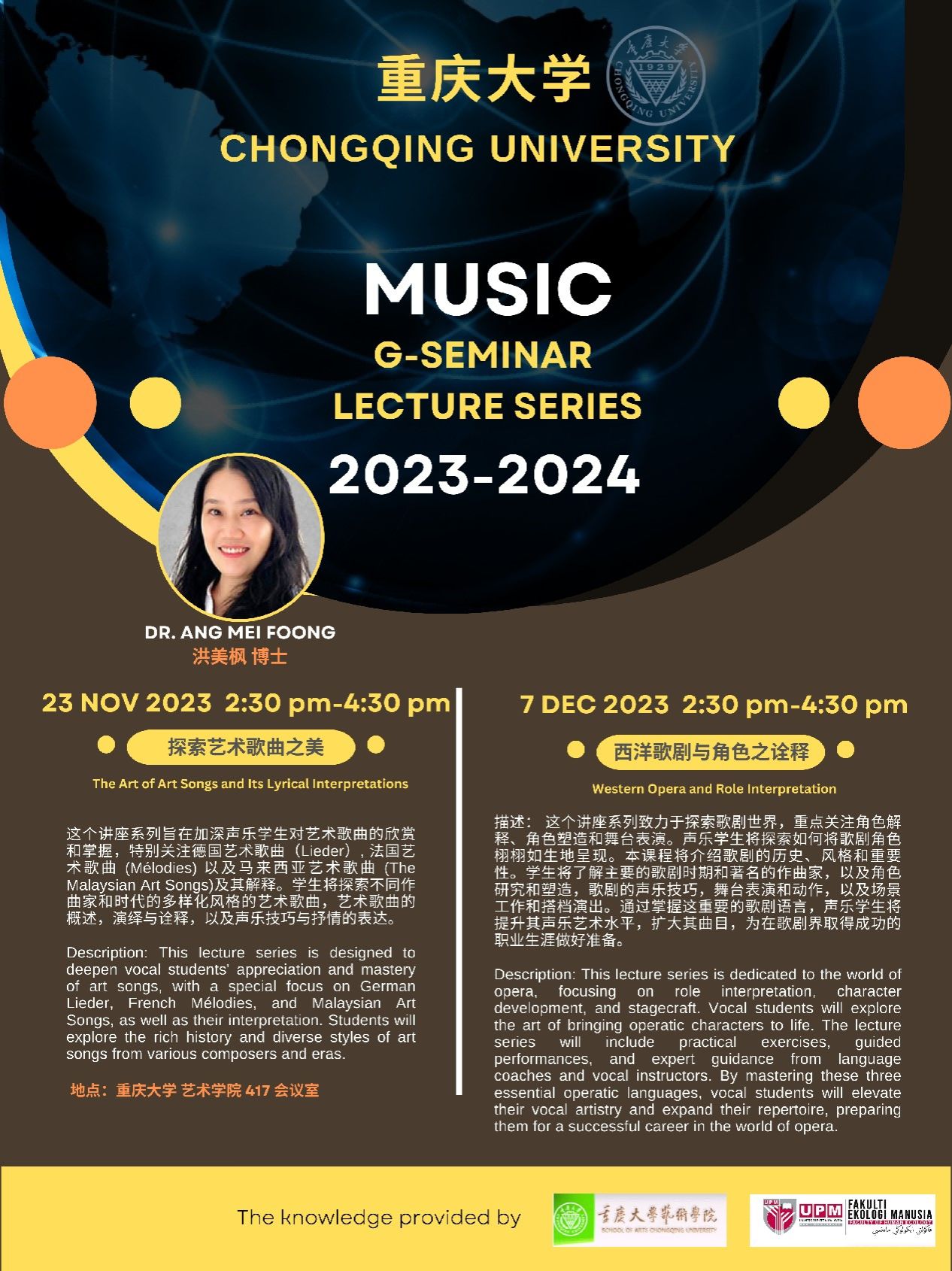 第一场讲座于11月23日(星期四)下午2:30—4:30,由马来西亚博特拉大学洪美枫(Ang Mei Foong)博士主讲,题目为《探索艺术歌曲之美》。线下地点在调教漫画 417会议室。