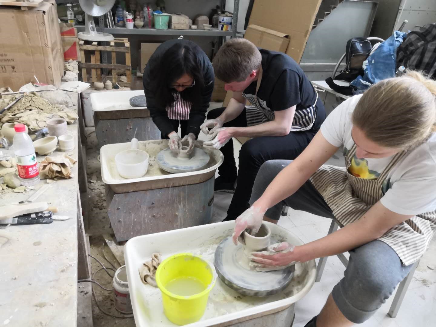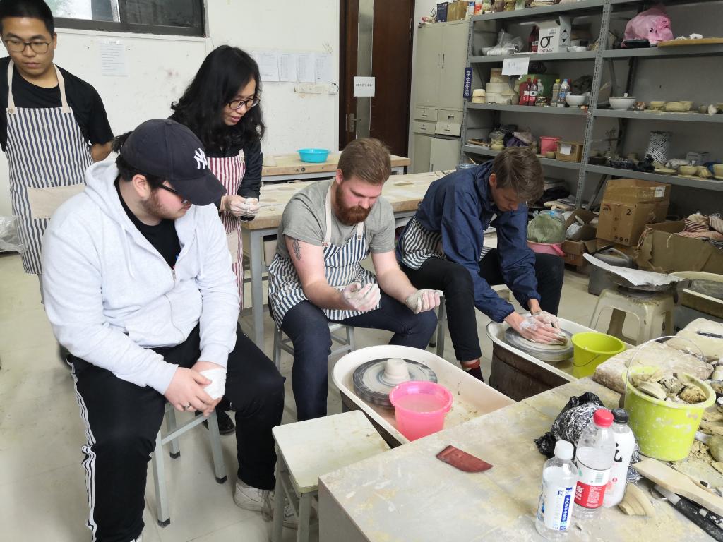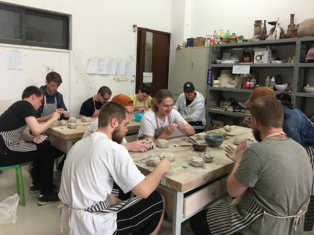 师生进行文化交流和陶艺制作。