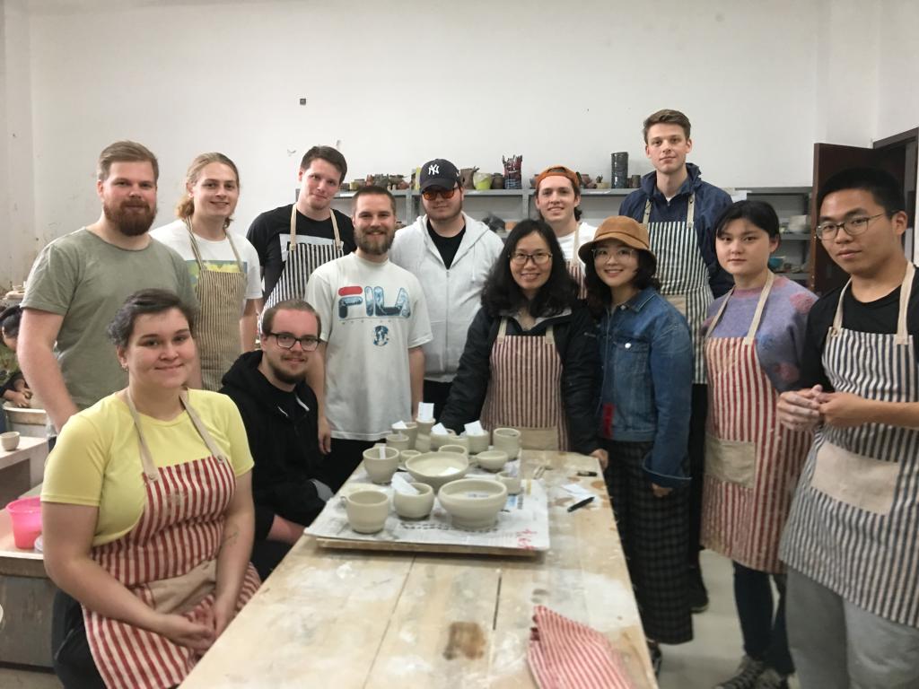 张红霞老师与3位志愿者同学,王丽琴、鲁芝铭和马志丹同学,热情地接待了这些远道而来的客人,带领他们参观了陶艺教室,并开始体验陶艺。这些挪威大学生此前从未做过陶艺,张红霞老师和志愿者同学们耐心地在2个小时的有限时间内教会他们揉泥,制作手捏陶塑作品和拉坯。最后每人都完成了一件手捏陶塑作品猫头鹰的制作,并初步掌握了拉坯的技巧,每人都完成了1-2件拉坯器皿的制作。挪威大学生们都很兴奋,享受与陶泥的亲密接触,体会陶泥在手指间的流动和变化。虽然只有短暂的两个小时,但他们的收获却非常大。一个星期之后,挪威大学生的陶艺作品都上釉烧成了,并被作为来自中国的珍贵礼物带回挪威。此次中外陶艺交流活动圆满成功。