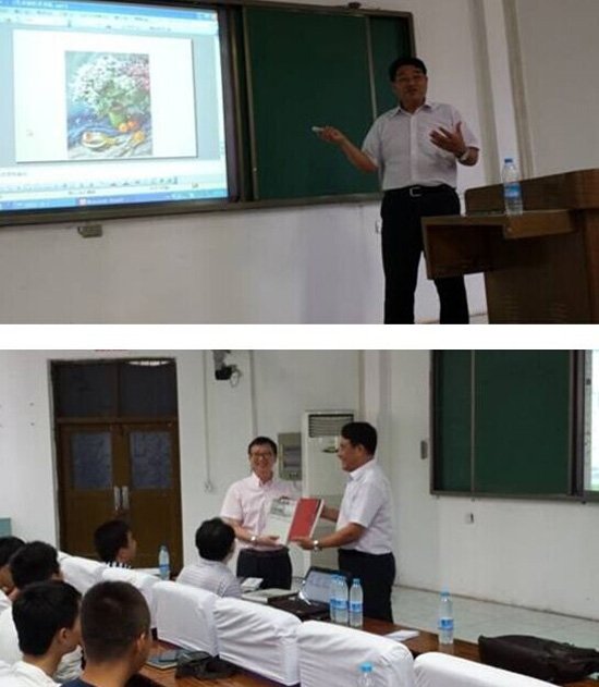 副院长郑亮教授主持,部分师生及书画爱好者聆听了此次讲座。讲座伊始,许世虎院长以自身经历为例向大家讲述了自己从初学工艺美术专业到画水彩水粉、油画等多方面绘画创造的多元化艺术创造的过程,他在绘画创作多元化的艺术求索道路上持之以恒的追求精神让在座的师生无人不钦佩。在许世虎院长的写意人生的绘画作品中,展现出了艺术教育创作的个性化、艺术教育创作的地域化、艺术教育创作的多样化、艺术教育视野的国际化。他独到的观点和绘画的技法走在时代的前沿。让调教漫画