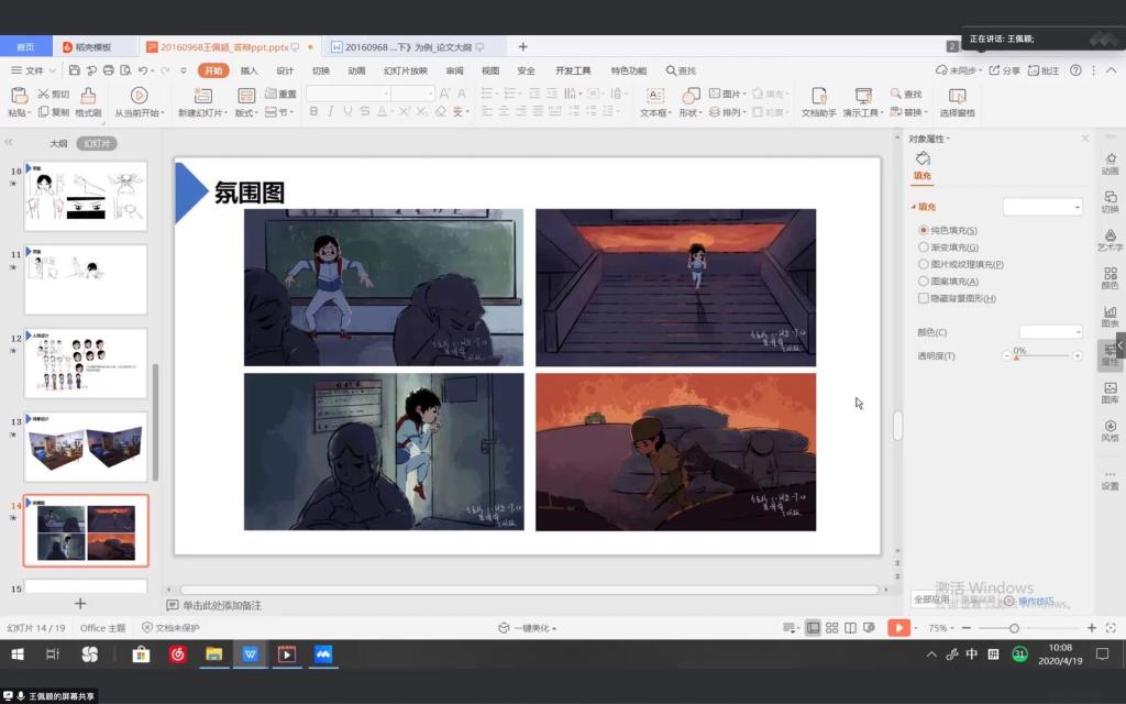 一整天的线上答辩汇报井然有序,同学们并没有因为疫情在家而放松学习,绝大部分同学保质保量完成了毕业设计各阶段要求的工作。老师们也一直则以严谨的态度尽心尽力在线提出各种建设性意见和建议,帮助同学们的作品和研究更上一个台阶。汇报的同学们准备充分,汇报认真,很多同学的作品质量较好,具有一定的展示效果和思想深度,体现出调教漫画
