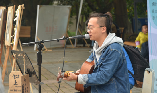 的歌手抱着吉他深情弹唱,现场的观众不仅能享受到一场视觉盛宴,更能得到听觉上的满足,伴着歌声,欣赏画作真是别有一番风味。观展者或是和结伴的朋友讨论画作的迷人之处,或是驻足于自己倾爱的画作之前沉思,揣摩其中的内涵。现场虽是嘈杂,却也不会显得浮躁,反而令人内心感受到一种独特的宁静。