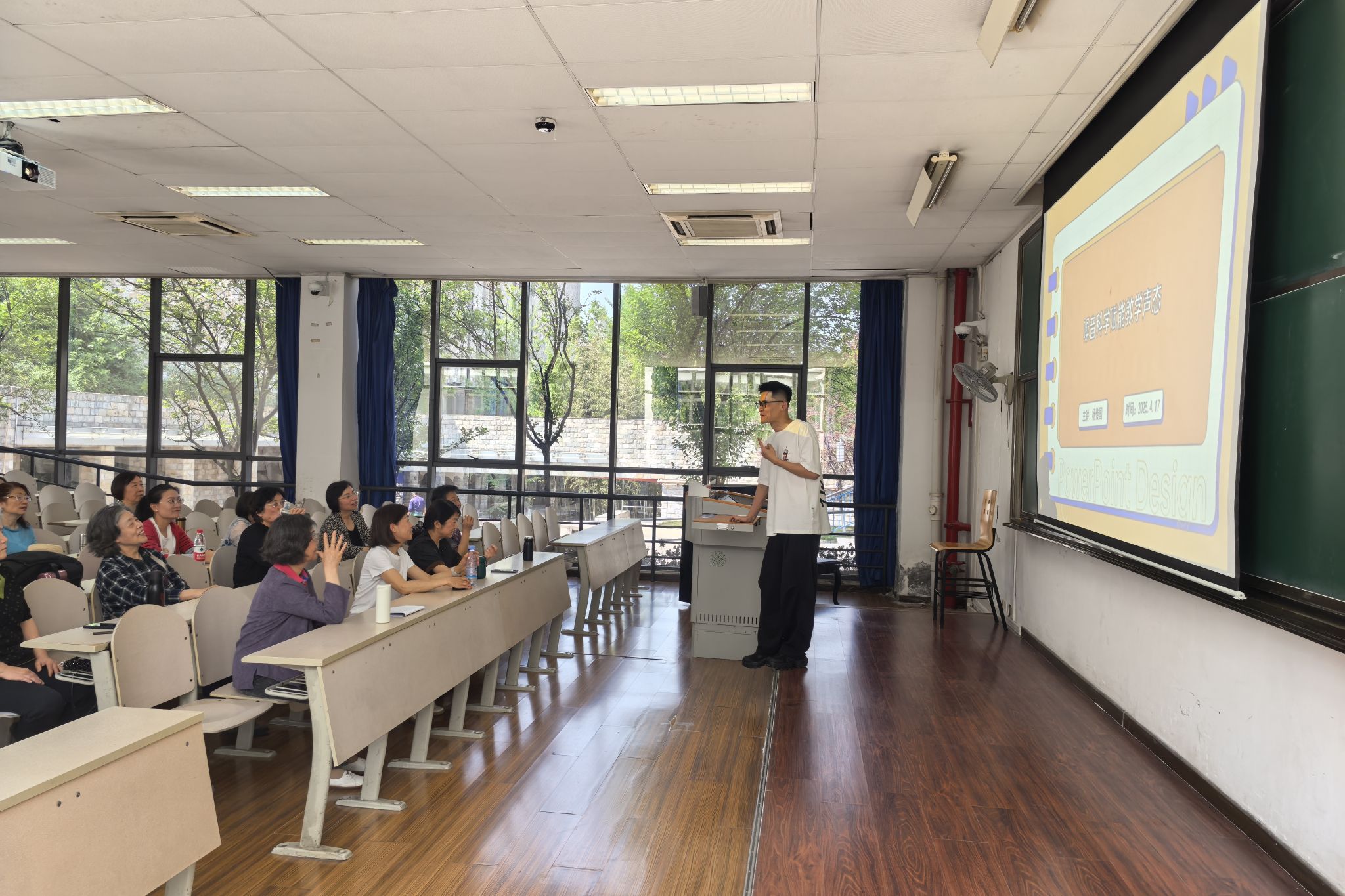 活动现场气氛热烈,杨传国通过气息训练小游戏、诗词朗诵互动等环节,让大家在沉浸式体验中掌握"以气托声、以声传情"的要领。参与教师纷纷表示,讲座内容直击教学实践中的发声困扰,尤其是共鸣调节技巧对大教室授课具有显著应用价值。