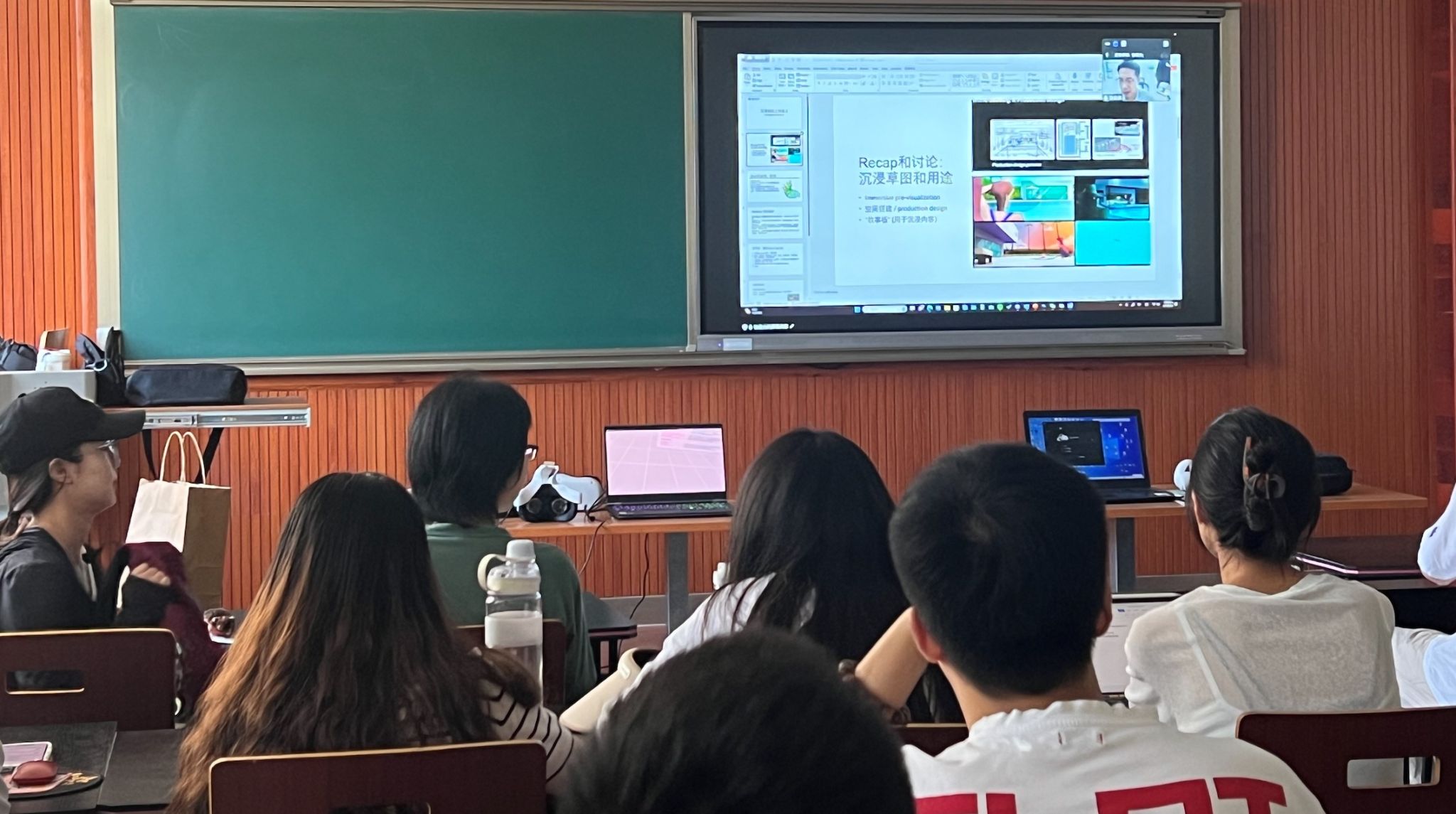 工作坊环节,香港科技大学艺术实践教授张俊杰博士为同学们带来了别开生面的沉浸式创作的实践和体验指导。如何将传统的纸上创作转移到数字环境,尤其是转移到沉浸式的虚拟三维空间中,打破透视绘图的传统习惯,进入空间绘画和互动式的内容创作,引发了同学们的强烈兴趣。不同于日常大众对VR头显设备的使用经验和理解,张俊杰博士带来了系统而全面的沉浸式数字内容创作的理论体系和实践技巧,从原理、工具、方法到应用拓展,深入浅出地引导同学们进入数字艺术与虚拟现实的世界。