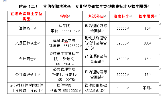 根据国务院学位办《关于2015年招收在职人员攻读硕士专业学位工作的通知》(学位办【2015】20号)文件精神,我校2015年招收在职人员攻读硕士学位,包括法律、工程、风景园林、公共管理、会计、示范性软件学院软件工程领域工程硕士,以“进校不离岗”的方式在职攻读硕士专业学位,为我国企业、工程建设部门、政法部门及政府机构培养应用型、复合型高层次技术和管理人才。