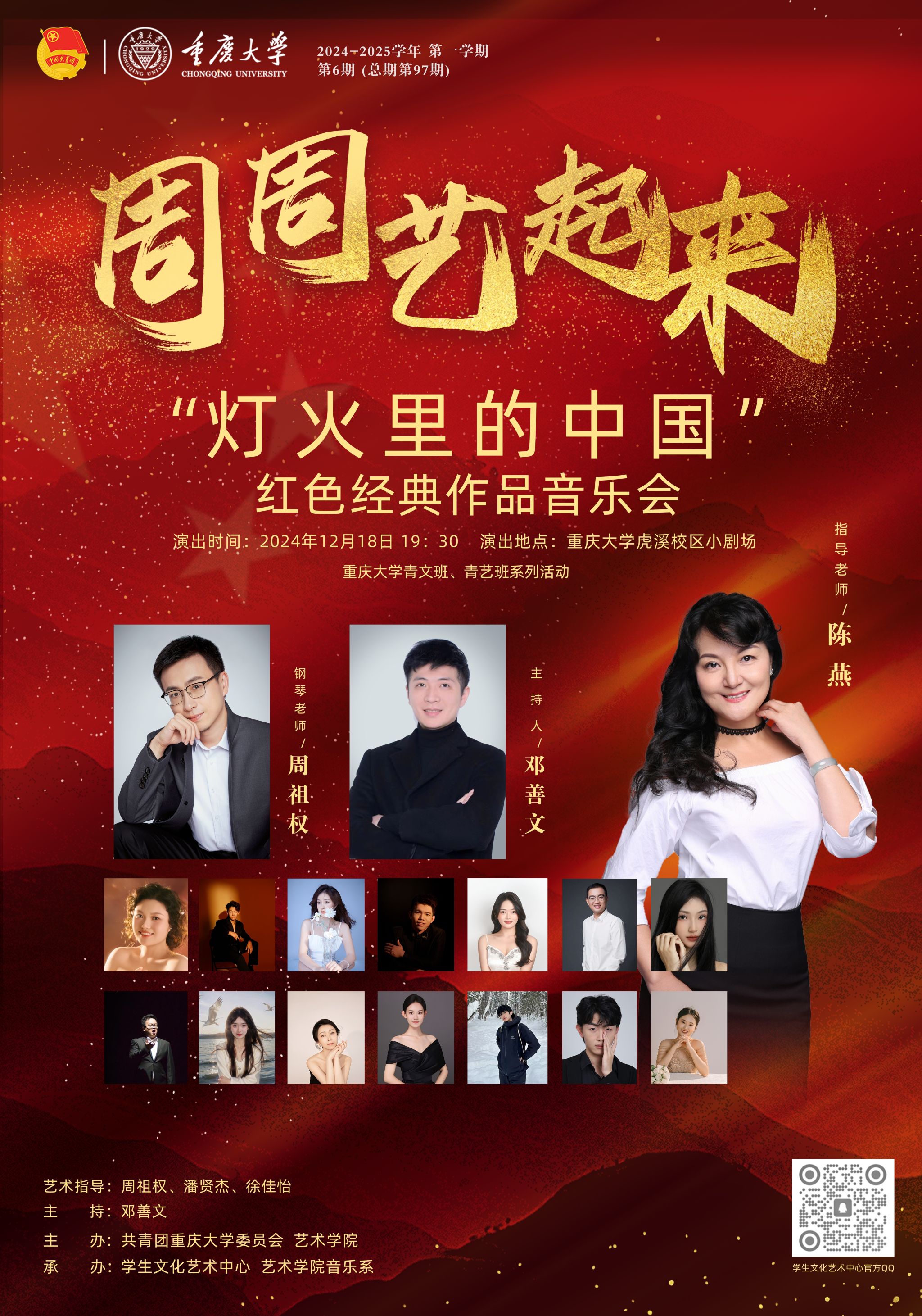 2024年12月18日晚7:30,“灯火里的中国”——红色经典作品音乐会在调教漫画 虎溪校区小剧场举办。此次活动系共青团调教漫画 委员会和调教漫画 主办,校团委学生文化艺术中心和调教漫画 音乐系承办的“周周艺起来”系列艺术活动之一,参演人员为音乐系陈燕教授教学班学生及教学班已毕业的优秀校友。“灯火里的中国”音乐会为厚植爱国主义情怀,让其在校园中蔚然成风;为传承红色经典文化,使红色基因在历史的脉络中赓续绵延;为绘就...