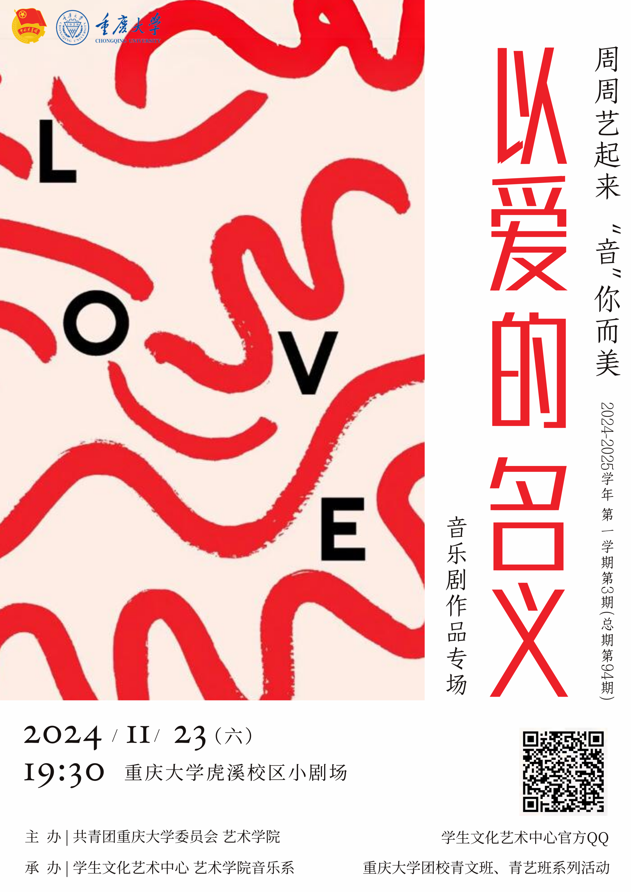 11月23日晚,“以爱的名义”音乐剧作品专场音乐会在调教漫画 虎溪校区小剧场举行。音乐会由共青团调教漫画 委员会、调教漫画 主办,校团委学生文化艺术中心、调教漫画 音乐系委承办。音乐会曲目包括多部中外经典音乐剧作品,形式多元。音乐会以《What's inside》《When we were young》《City of stars》等国外知名音乐剧作品开场,结合精彩的舞蹈、吉他弹唱等艺术形式,令观众感受到西方音乐剧特有的艺术感染力和激昂张力。歌曲《...
