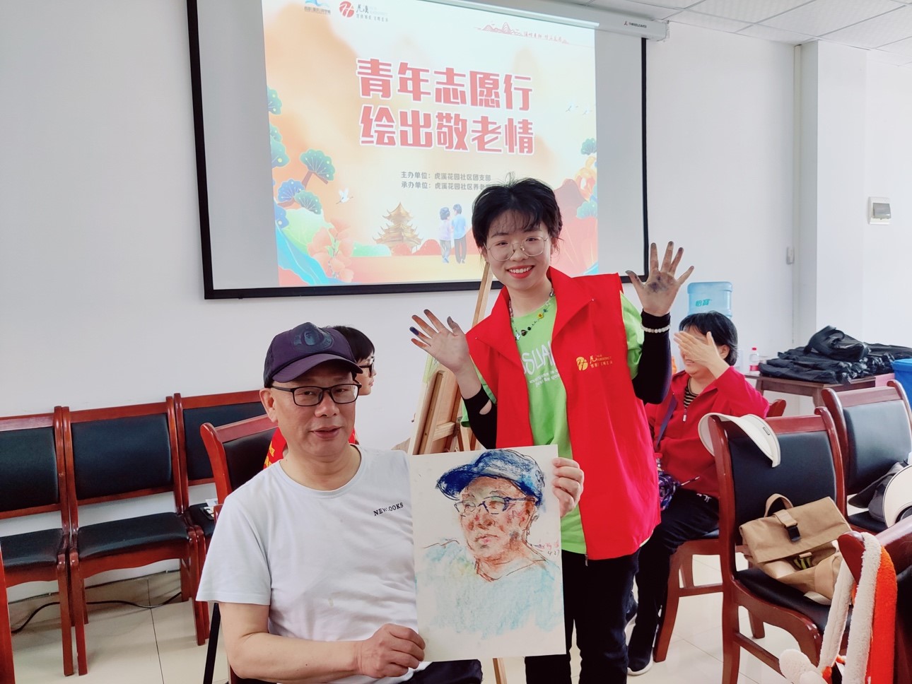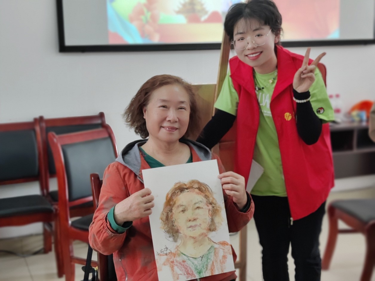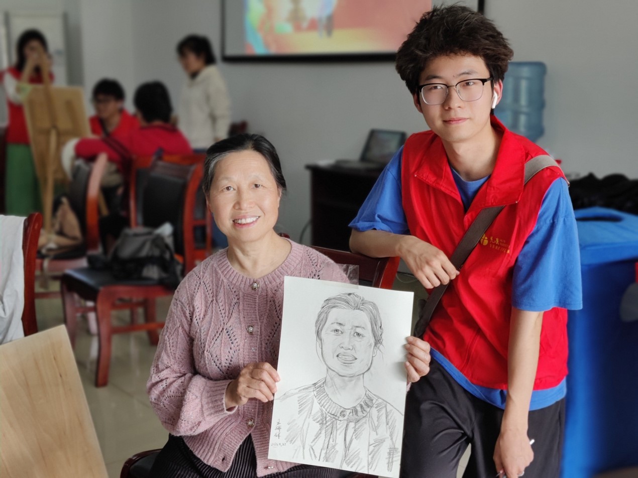 大学生志愿者们格外认真,充分发挥各自的专业实力开始构图、勾勒,时不时与老人们互动,描摹他们的一颦一笑,不到一会儿,一幅幅动人的肖像画就呈现在大家面前。这种双向奔赴的温暖无比美好!