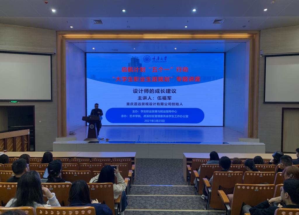 01级校友,重庆道远景观设计有限公司创始人伍福军,主题是“设计师的成长建议”。学院党委副书记王琦、辅导员余华君、杨传国老师参加此次讲座。