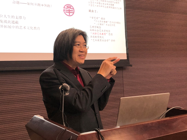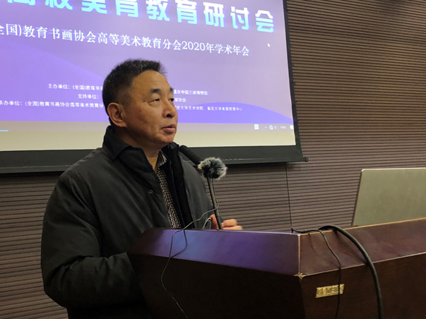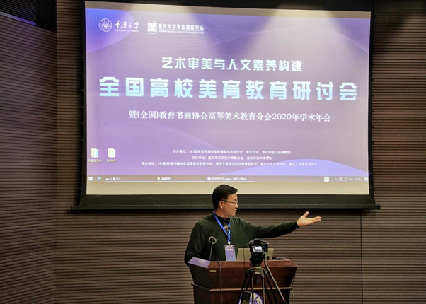 学术院长,四川美术学院艺术人文学院院长,博士生导师黄宗贤教授做了《新文科建设中美育的担当与使命》的主旨宣讲。黄宗贤教授现为国家社科重大课题首席专家,教育部艺术教育委员会委员,教育部高校美术专业教指委委员,高等美术教育学会常务副会长,中国美术家协会理论委员会副主任,特聘巴渝学者讲席教授。黄宗贤教授先后出版的重要著作有《佛陀世界》、《大忧患时代的抉择—大后方美术研究》、《抗日战争美术图史》、《中西雕塑艺术比较研究》、《艺术批评》、《陪都画坛辑佚》、《从原理到形态—普通艺术学原理》等,发表重要论文上百篇。在主旨演讲中,黄宗贤教授以一种高屋建瓴的宏阔视野,从新文科建设的整体态势和发展趋势出发,对美育的时代担当与使命——中华美育的历史传统、社会文化价值以及与当代美育发展的内在基元、关系,进行了生动化、丰富性、开放式的系统阐发,提出美育的根本品质和人文精神在于有情、有意、有趣的相互作用、相互启发、相互作用,培育人的人文情怀、人文精神、人文素养和健全人格才是当代美育的核心人物和努力目标。