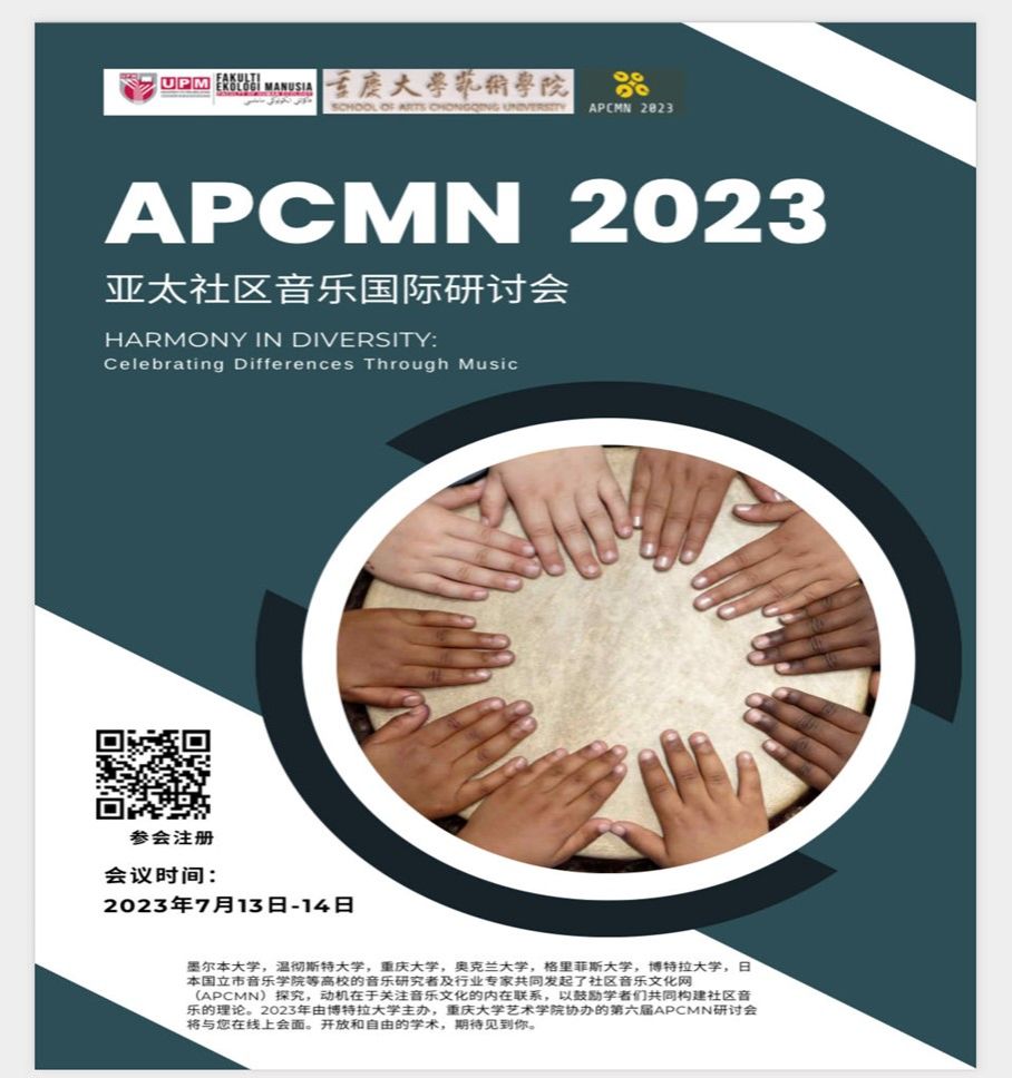 协办的第六届亚太社区音乐研讨会(Asia Pacific Community Music Network ) ,将于2023年7月11日至15日在博特拉大学的Rashdan Baba会堂召开。亚太社区音乐国际研讨会(APCMN)是由联合国教科文组织和国际音乐理事会的附属机构“国际音乐教育协会”(International Society for Music Education)每两年在不同成员国举办的学术会议,主要通过委员会ISME成员分享和相互合作,传播关于音乐教育及其相关专业领域发展的信息。