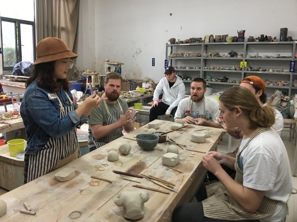 师生进行文化交流和陶艺制作。