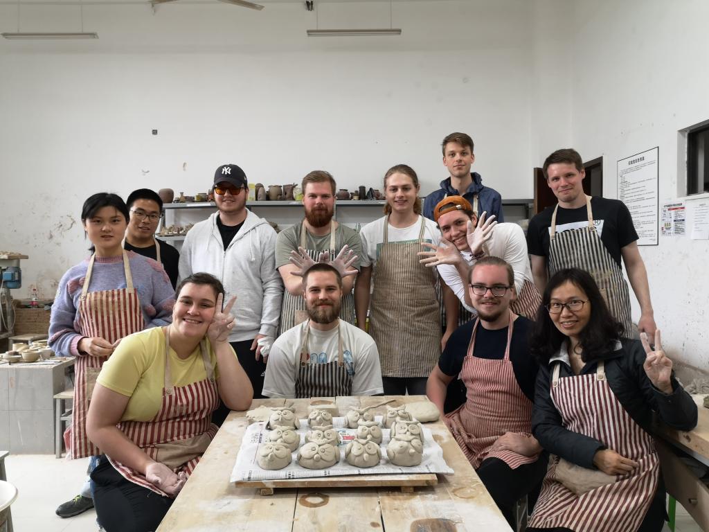 张红霞老师与3位志愿者同学,王丽琴、鲁芝铭和马志丹同学,热情地接待了这些远道而来的客人,带领他们参观了陶艺教室,并开始体验陶艺。这些挪威大学生此前从未做过陶艺,张红霞老师和志愿者同学们耐心地在2个小时的有限时间内教会他们揉泥,制作手捏陶塑作品和拉坯。最后每人都完成了一件手捏陶塑作品猫头鹰的制作,并初步掌握了拉坯的技巧,每人都完成了1-2件拉坯器皿的制作。挪威大学生们都很兴奋,享受与陶泥的亲密接触,体会陶泥在手指间的流动和变化。虽然只有短暂的两个小时,但他们的收获却非常大。一个星期之后,挪威大学生的陶艺作品都上釉烧成了,并被作为来自中国的珍贵礼物带回挪威。此次中外陶艺交流活动圆满成功。