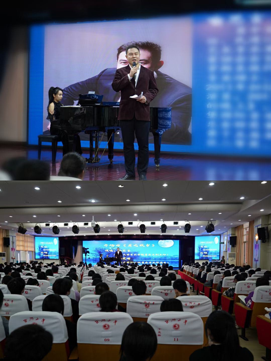 10月28日下午4点30分,在万州第二中学报告厅,由喻思言老师带着浓浓的思乡之情所演唱的《月之故乡》拉开了展演的序幕。 作为万州人,喻思言老师也是此次展演的总策划人与音乐交流分享会的导赏者,从分享他的声乐历程开始引入,然后对每一个板块的经典歌曲如:中外艺术歌曲、中外经典歌剧选段以及中国古典诗词歌曲等逐一进行了深入浅出的讲解。使在场师生感受到了一场别开生面的音乐会,并获得师生们的连连赞许。