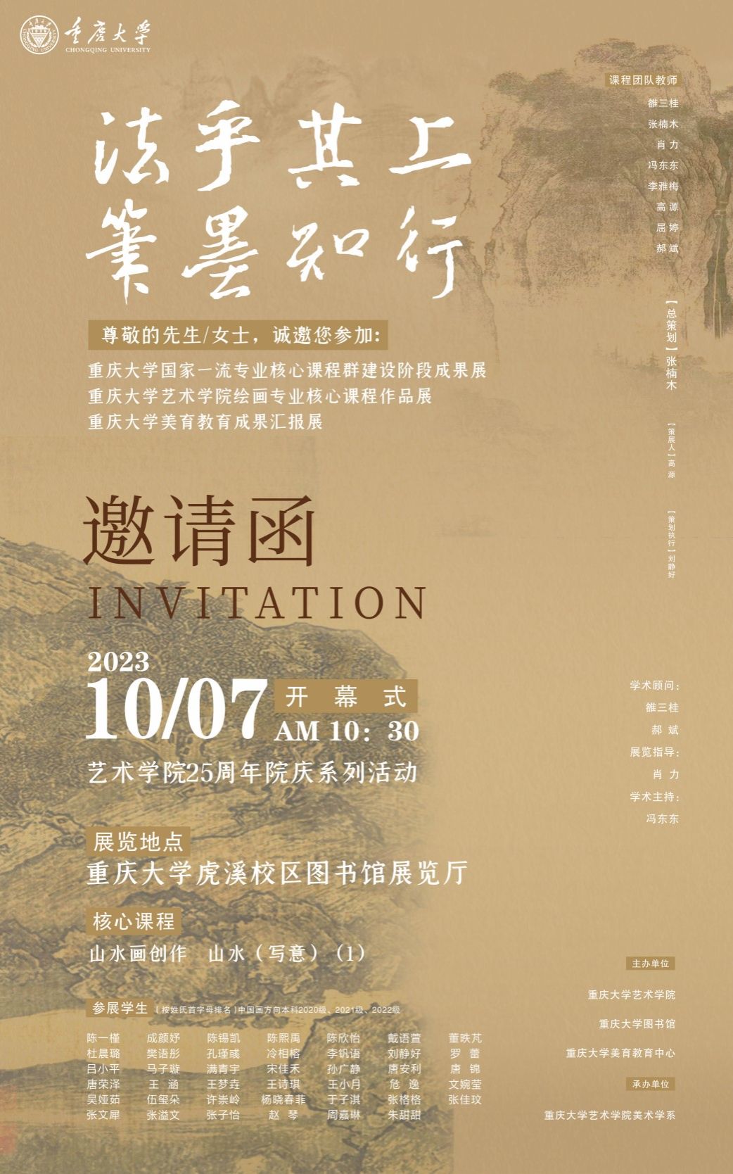 法乎其上,掇菁撷华。展出作品来自课程团队教师与中国画方向2020级、2021级、2022级本科生。展览分为“山水-源”“山水-融”“山水-新”三个主题单元,其中“山水-源”旨在探寻中国传统山水,对历代名家的经典山水画作进行临摹,在收获与传统经典山水对话的同时,为日后的写生与创作环节奠定坚实基础;“山水-融”汇聚传统的审美精神与当代的气息风貌于一体,展示山水画写生作品,化古为我、寓情自然,为山水画创作收集素材、积累经验、提供灵感;“山水-新”主推山水画创作,立足传统、推陈出新、创造未知,展现青年学子独特的艺术视角、浪漫的审美特征和饱满的精神面貌。