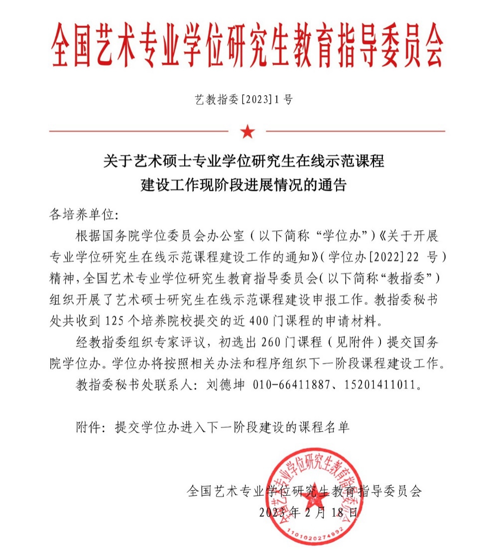 为加强艺术硕士专业学位研究生课程建设,加快教育数字化转型,推进优质资源共享,根据国务院学位委员会办公室《关于开展专业学位研究生在线示范课程建设工作的通知》(学位办[2022]22 号)精神,按照全国艺术专业学位研究生教育指导委员会《关于艺术硕士专业学位研究生在线示范课程建设申报工作的通知》,推荐五门课程参评全国艺术硕士研究生在线示范课程建设。