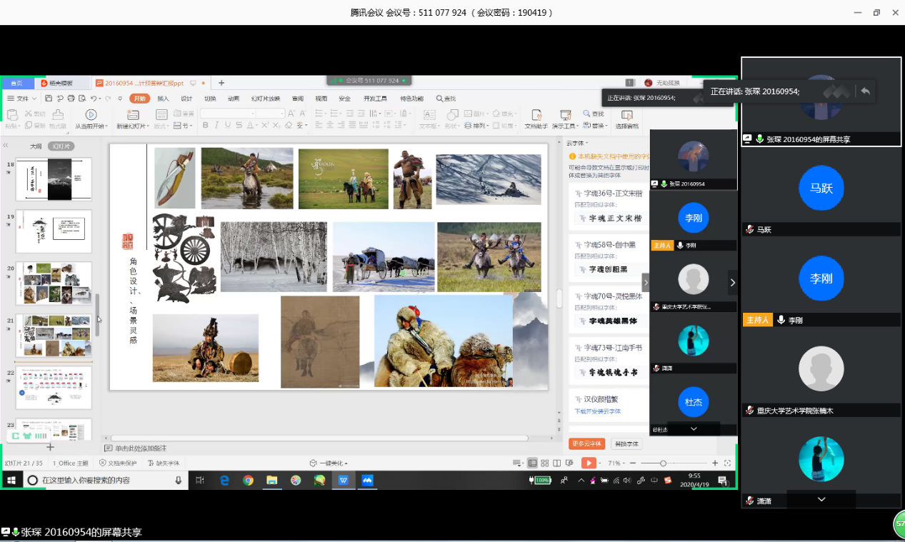 预答辩前一天,参与预答辩的26位同学提前把所完成的答辩资料汇总后通过邮件提交给老师们,方便答辩过程中老师们能够在本地查阅观看。4月19日上午9:15,参与预答辩的老师、同学们陆续进入腾讯线上会议室,大家纷纷打开摄像头、麦克风打招呼。所有人测试完成后,9:30同学们按预先抽签顺序通过共享屏幕结合自己的PPT展示开始正式答辩。在答辩过程中个别同学出现掉线、屏幕共享失败的问题,但在老师、同学们的帮助下都得到了解决,答辩过程进展顺利。