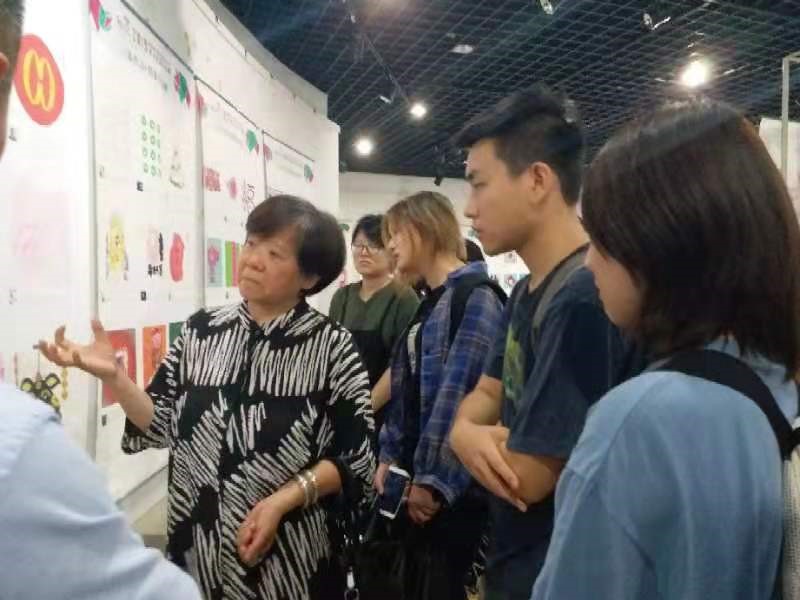 教师要在学校美育教育上积极贡献智慧和力量。戚序教授与同学们一起边参观边讲解,她强调设计一定要有内涵,好的设计要有前期调研、分析归纳、元素提取、形式表现等,希望同学们多读书,多查阅文献。