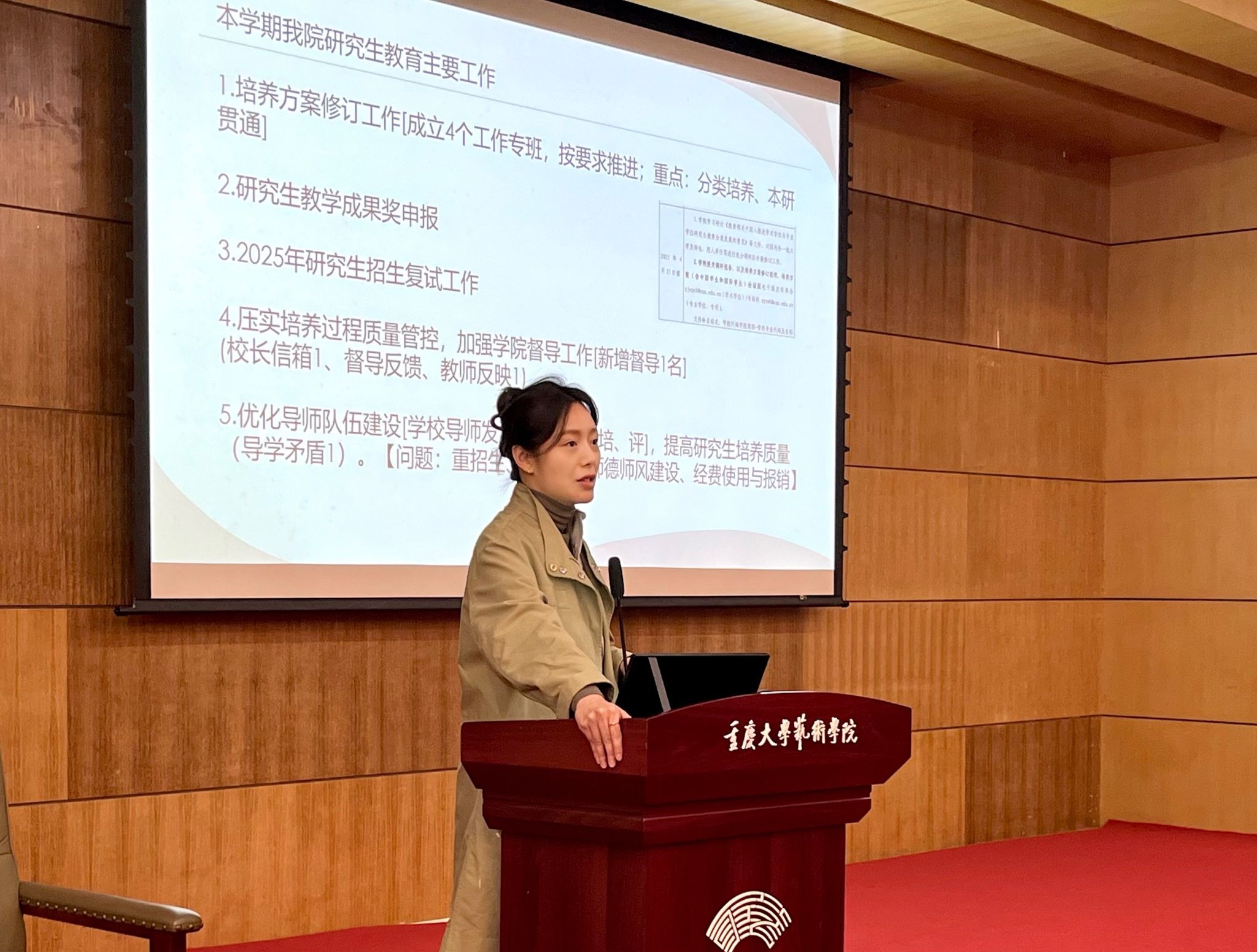 彭小希首先分析了学院导师队伍的整体结构及发展情况,重点介绍了研究生推免工作的成效,对近两年研究生出国境交流情况、参与国际交流的成果进行了总结,通报了研究生在科研项目中的参与度及取得的成果,充分肯定了学院导师团队在研究生教育工作中取得的成绩。其次,彭小希对学院已完成的工作及本学期重点工作进行了通报和部署。她指出,学院研究生教育工作在过去一年中取得了较大进展,本学期将继续秉持“质量为先”的理念,深入推进研究生培养方案、课程建设的优化调整,压实培养过程质量管控,优化导师队伍建设。