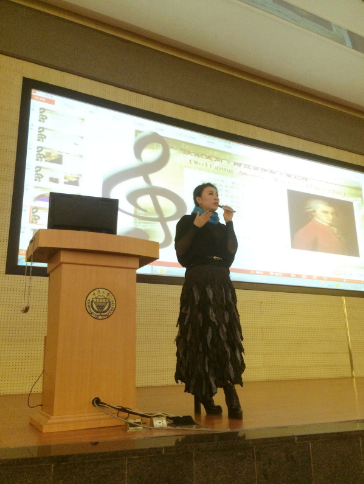 紧接着苏勤老师正式开始对古典音乐进行了系统的讲解。主要为大家介绍了古典主义时期三位伟大的音乐家——海顿、莫扎特、贝多芬。苏勤老师带我们了解三位音乐家的生平,给我们欣赏并分析了很多他们经典的耳熟能详的作品,整个现场都沉浸在音乐的世界中。苏勤老师以她过硬的专业知识和幽默风趣的语言风格,为我们带来了一场精彩绝伦的古典音乐讲座,使同学们了解到古典音乐并不是那么遥不可及,也让许多原本对古典音乐非常陌生的同学有了一个基本的概念。