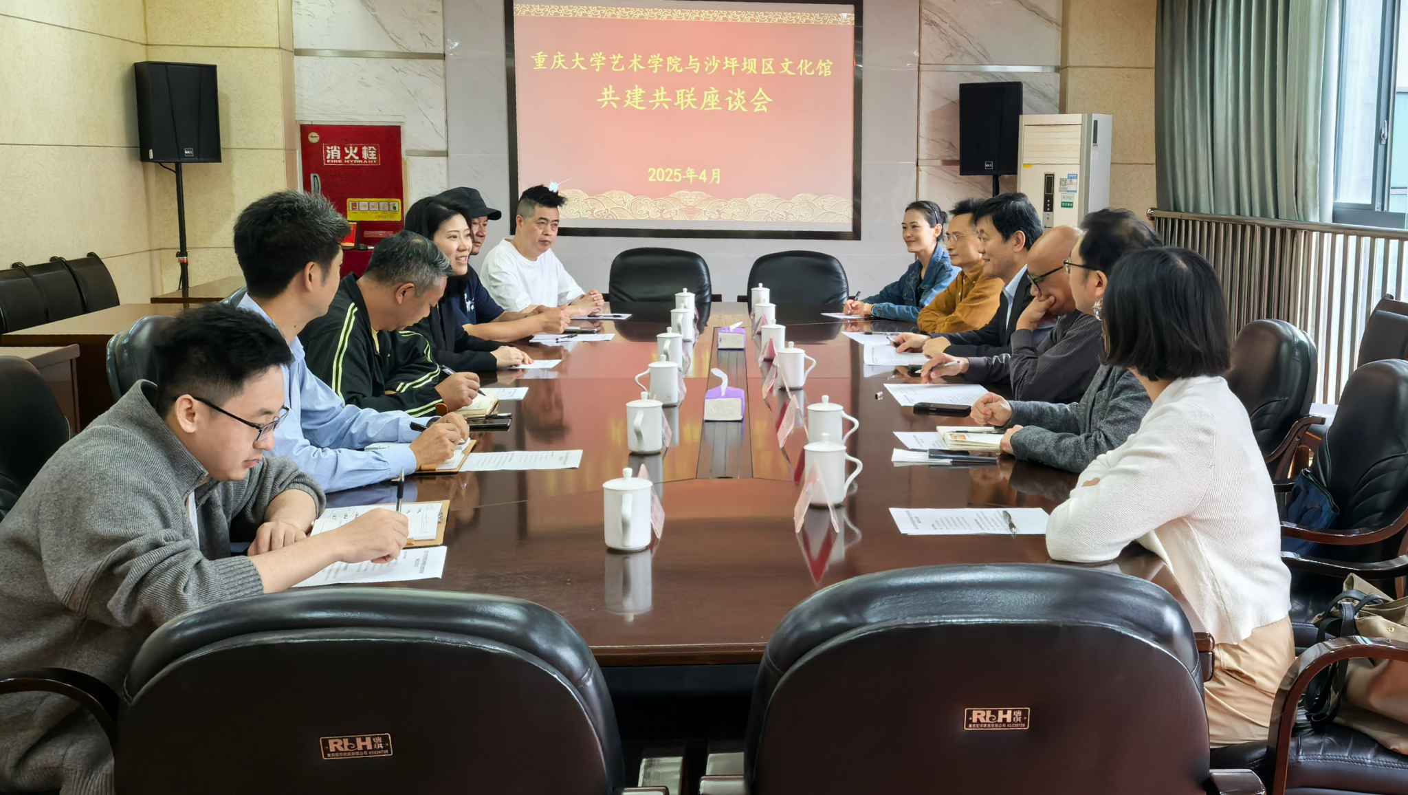 张楠木院长率队赴沙坪坝区文化馆,进行共建共联座谈活动。重庆沙坪坝区文化和旅游发展委员会党委书记汪黎黎、公共服务科科长陈永甫,沙坪坝区文化馆副馆长唐亮、视觉艺术部主任李运来、副研究馆员张洪、艺术部馆员李祥,调教漫画