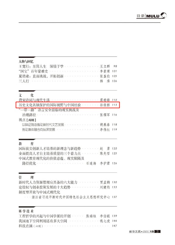 设计学系孙俊桥教授发表在《南京大学学报》中的《历史文化名镇保护的国际视野与中国经验》一文,被《新华文摘》2023年第15期全文转载。